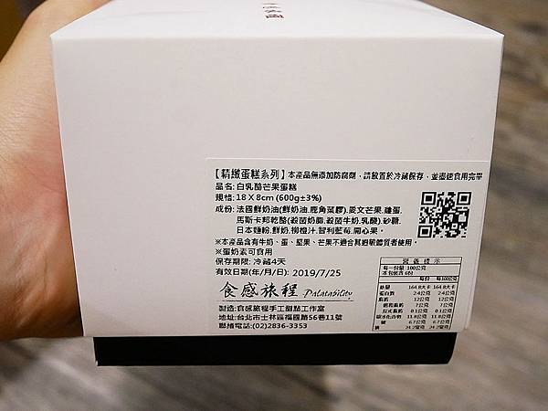 包裝側面貼著蛋糕的詳細資料,包含重量、成份等等