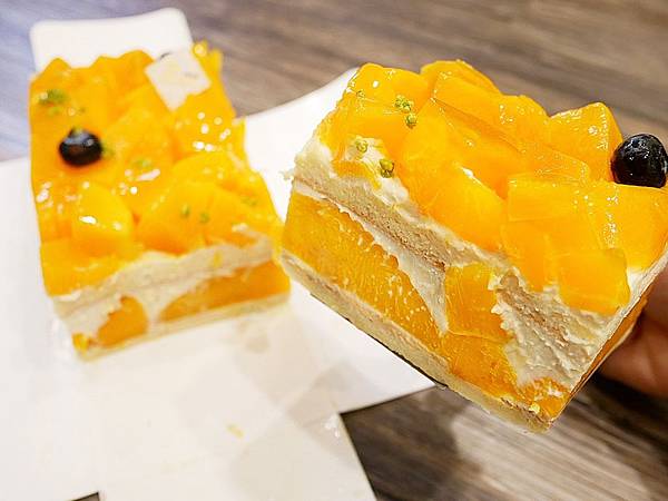 芒果蛋糕超有份量,拿起來沉甸甸的,由滿滿芒果和白乳酪堆疊而成的