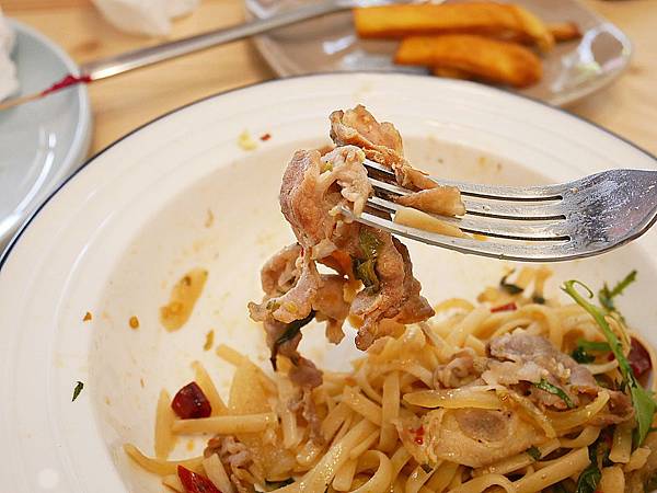 義大利麵使用扁麵,吃起來還算有嚼勁,但比較不是保留麵心的那種口感
