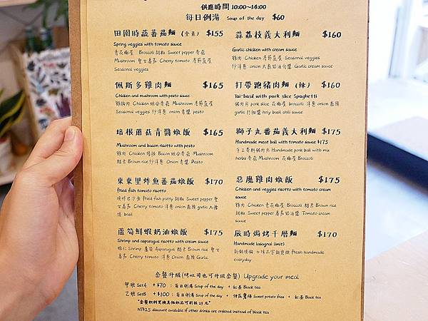 店內的餐點以吐司、義大利麵、燉飯為主,選擇種類還不少,飲料更是兼具美味和健康