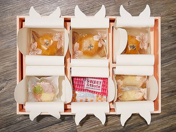 裡面包含四大類的點心,包含蛋黃酥、鳳梨酥、玫瑰酥和水果軟糖,種類豐富又繽紛