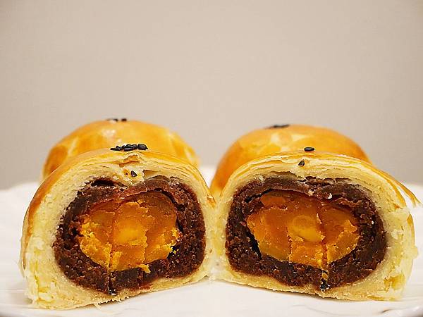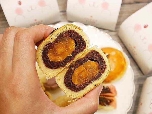 蛋黃酥很厚實,中間的酥皮很有層次但不會太有負擔,入口不會太油膩