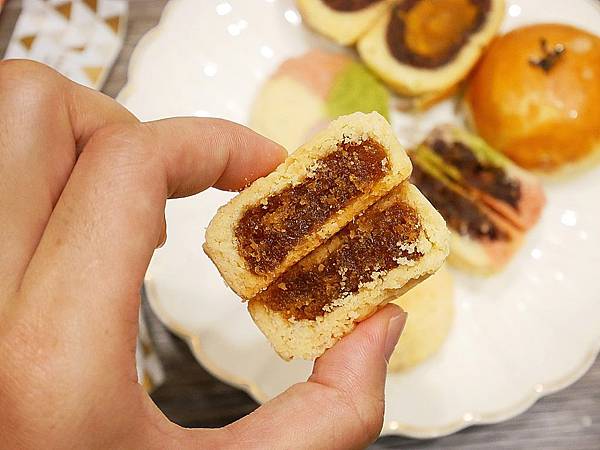 中間的餡料是用鳳梨熬煮而成再拌入玫瑰花,所以吃起來跟鳳梨酥滿像