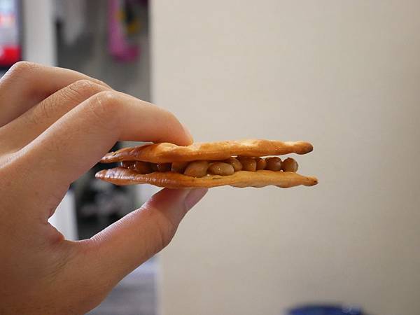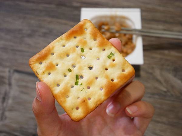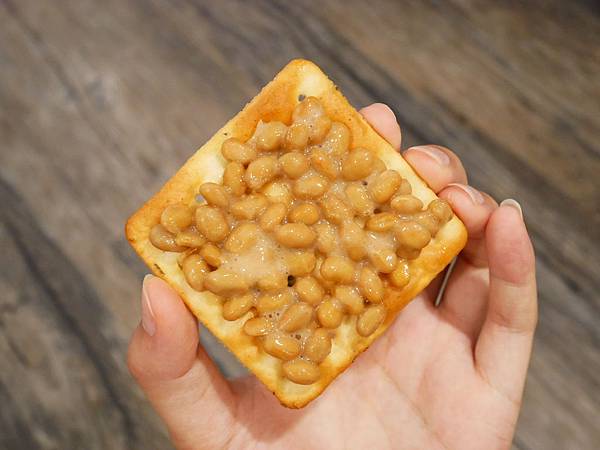 像西班牙TAPAS一樣,將納豆鋪在酥打餅上頭,可以直接入口也可以再鋪上一片餅乾做成三明治