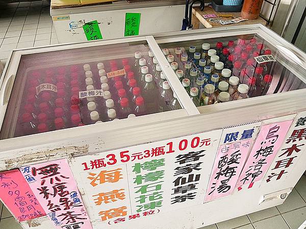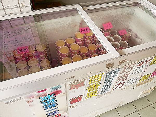 店門口有兩大檯的冰箱,裡面放滿各種消暑飲品,還有各種口味的冰淇淋
