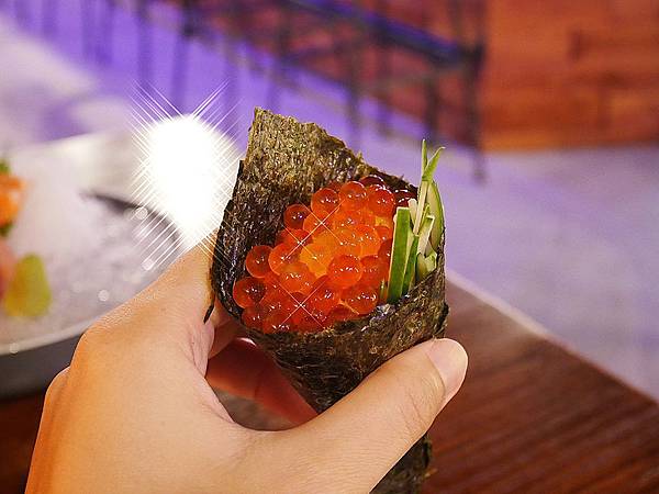 手卷一上桌,立刻被上頭橘橙橙的鮭魚卵給吸引,份量真的給不少,好像一顆顆龍珠