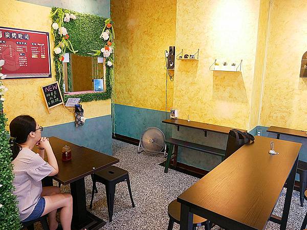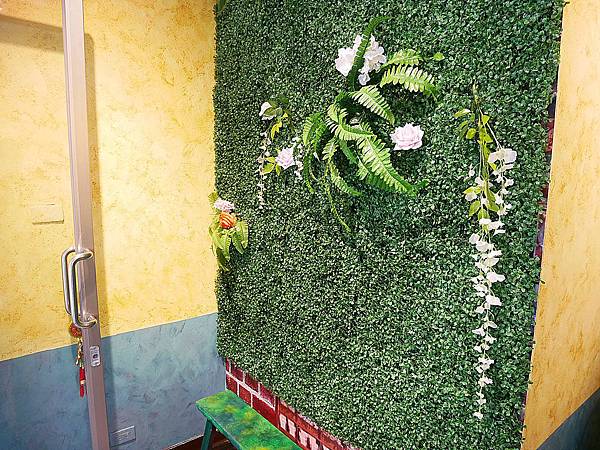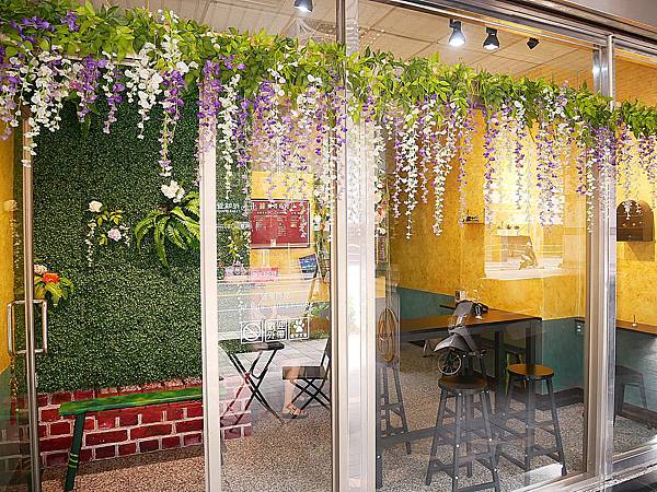 上締炭烤吐司的外型滿顯眼,除了在門口就能看到一大面花牆外,門口也掛滿花