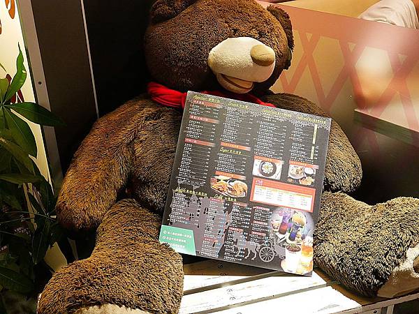店門口放了一隻大熊,手捧菜單要給路人們觀賞