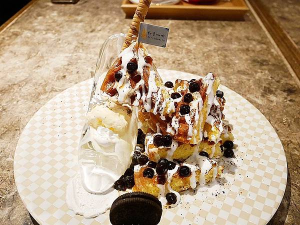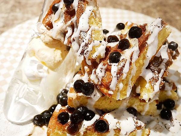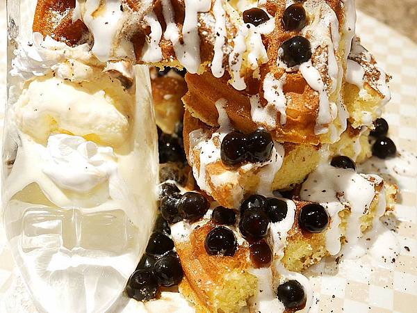 旁邊的鬆餅堆疊在一起看起來份量還不少,珍珠口感很Q彈,不過中心稍微偏硬