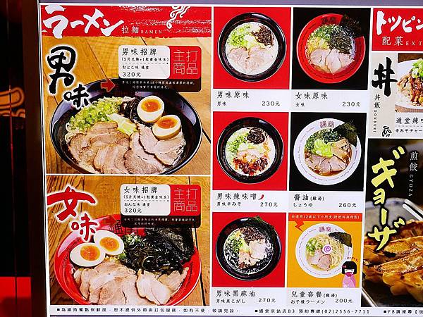 店家的拉麵以男味(豚骨)為主,其中招牌、原味有做女味(雞湯)的