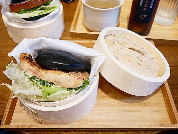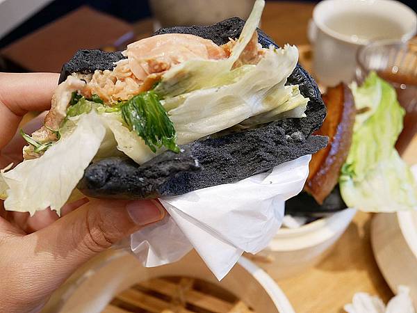 蒸籠蓋一掀開,超大塊的肉以及滿滿生菜直接蹦出來,外層的黑色麵皮超醒目