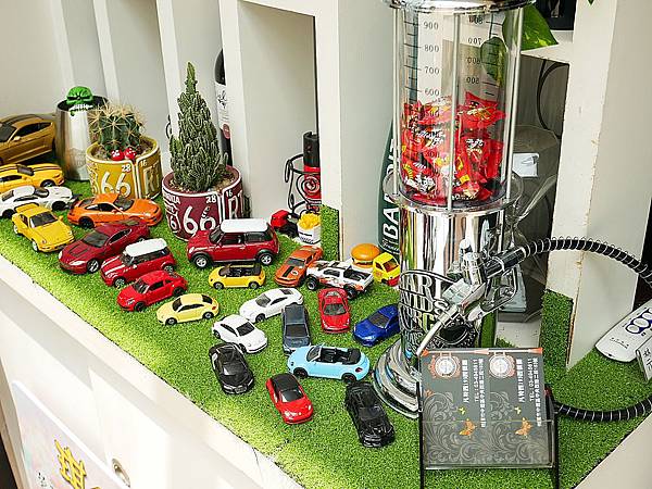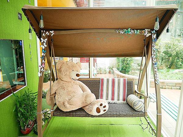 店內的玄關除了有大熊坐在搖椅上迎接外,另一側是帥氣擋車承接灑落的艷陽
