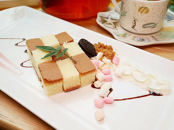 蛋糕的口感還挺紮實,不算濕潤,所以搭配著飲料一起享用會更剛好