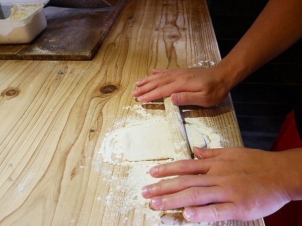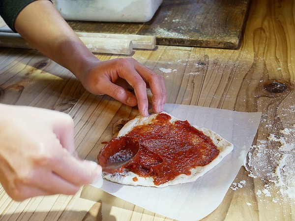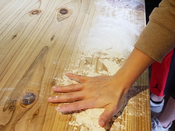 DIY的披薩只有5吋所以麵團並不大屬於玩票性質,店家的麵糰已經都處理好,我們只要完成後續步驟就好,其實非常簡單,連很多爸媽都放手讓小朋友完成,拿到麵糰後,記得先用沾了點麵粉的手將麵糰壓平