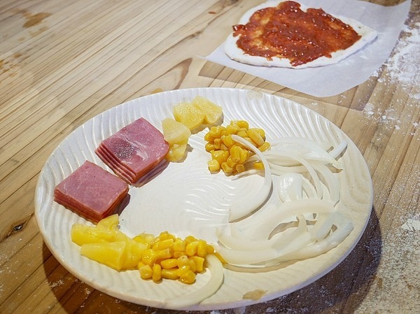 店員拿出一盤食材,這是用來鋪在麵皮上的配料,這是兩份披薩的量,老實說並不多,但配色還算豐富,而且麵皮不大,所以鋪完其實還挺豐盛,這時候又是考驗藝術感的時間,男友很隨興的擺上食材,而姊妹則一把一把仔細鋪平,看起來好吃多了