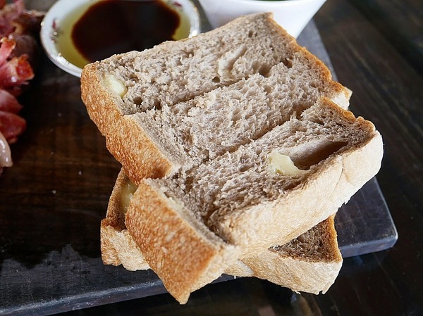 這就是傳說中的微笑土司,分享餐會附兩大塊,當天拿到仙草乳酪,風味真的好特別,入口很單純的麵包香,雖然仙草的風味品不大出來,但細細咀嚼相當耐吃,中間夾入不少乳酪塊,所以會吃到些許乳酪的味道,口感不會太乾,意外很Q彈 ,是好吃的吐司,旁邊有附橄欖油+巴薩米克醋醬可以搭配享用,但靜香還是喜歡吃原味