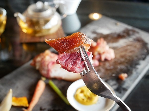雖然有這麼多烤蔬菜陪襯,但主角-豬腳才是最厲害的,份量不算少,但以靜香的食量可以自己吃掉一份,豬腳口感非常Q 雖然不若之前吃過的德國豬腳那麼脆皮 但風味完全不輸,調味相當剛好,豬腳本身的香氣表露無疑,不沾醬一樣好吃,雖然部分的皮有點偏硬,但整體都很Q彈耐嚼,膠質的地方完全沒有肥膩感,相當好入口,瘦肉的地方不會太乾硬,口感還算細緻真的滿好吃的,連不愛豬腳的男友都連吃好多塊