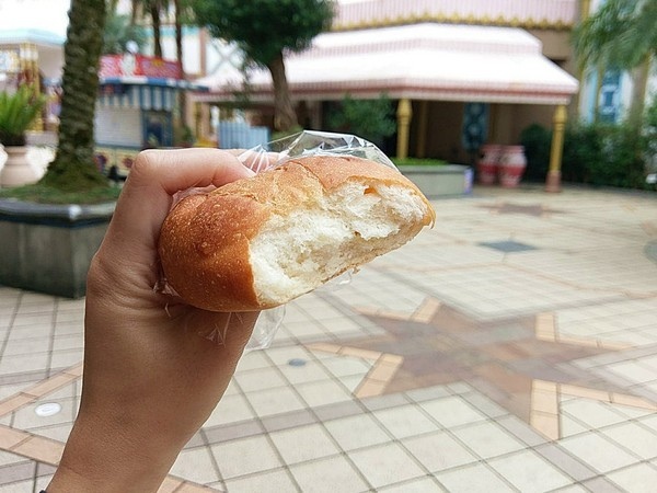 這是好姊妹指定的口味,乍看之下會以為外層是類似法棍一般較有嚼勁的口感,但咬開才發現口感是鬆綿的,裡面夾著切達起司和奶油起司, 入口鹹香不油膩,越吃越喜歡,我們明明剛吃飽,但才剛進到皇宮區玩完飛天魔毯,立刻把麵包開來吃,到底是多嘴饞