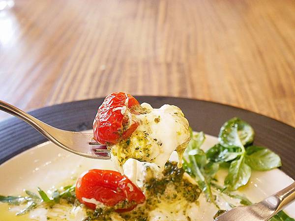 這道沙拉是由水牛布拉塔起司、羅勒松子青醬、慢烤番茄和橄欖油搭配而成