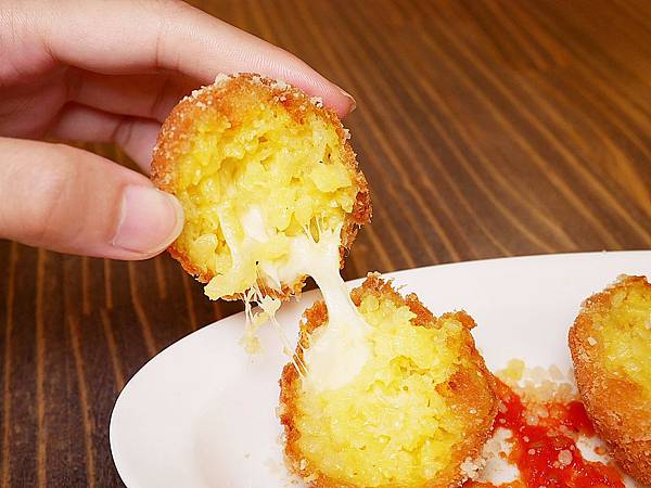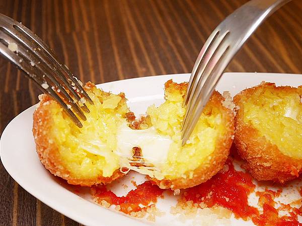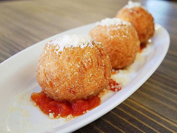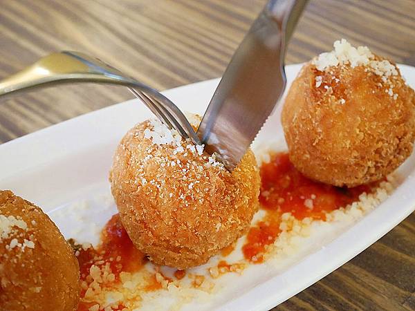 燉飯球的麵衣相當酥脆,但對我來說有點太脆硬,如果麵衣再薄一點我會更喜歡