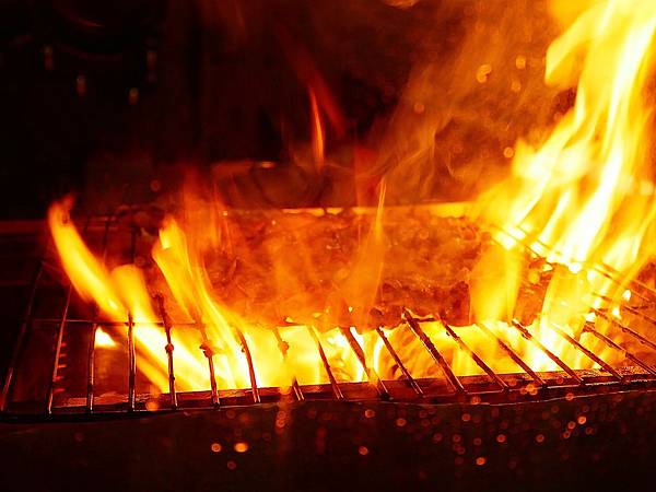 店員將肉片一條條鋪平在烤網之上,沒多久就發現火越燒越旺