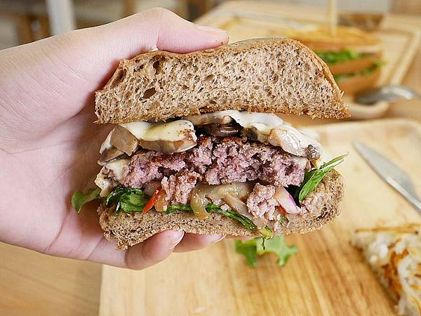 原昇行的漢堡SIZE比吐司小一些,不過相當厚實,視覺感也挺豐富。