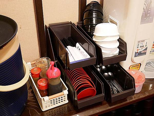 八八食堂的餐具、醬料、茶水都放在櫃台附近