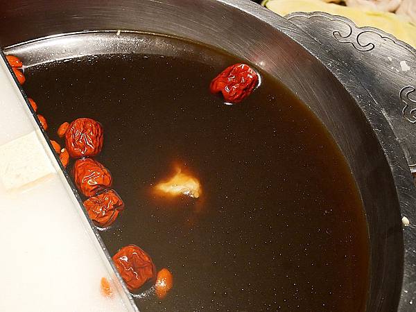 養身藥膳是黑湯,裡面的鍋底包含枸杞、紅棗和豬大骨