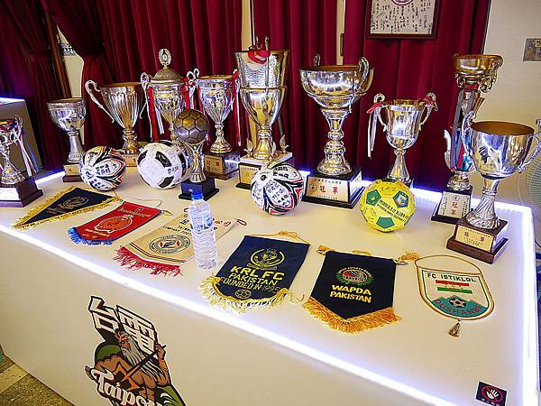 照片牆旁邊有很多桌子,每張桌子都擺上各個球隊的戰利品