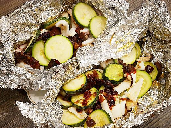 靜香將香菇、櫛瓜和透抽都放到鋁箔紙上頭就完成第一步啦!!