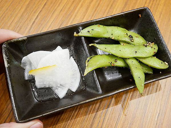 一入坐店員就送上招待的小菜,裡面包含漬蘿蔔和毛豆