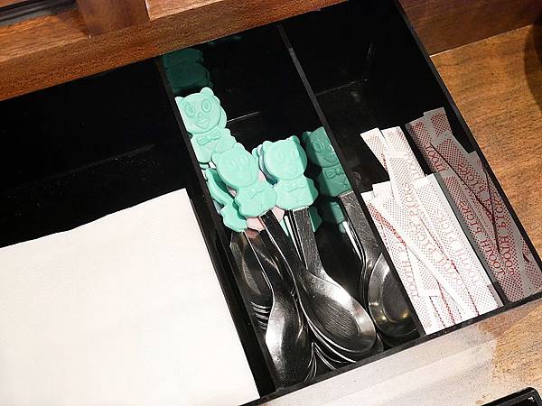 二鬼麵舖採半自助式,餐具、醬料和茶水都放在櫃台對面的桌上。店家還特別幫小朋友準備可愛小湯匙,讓小朋友也能自己挖著吃