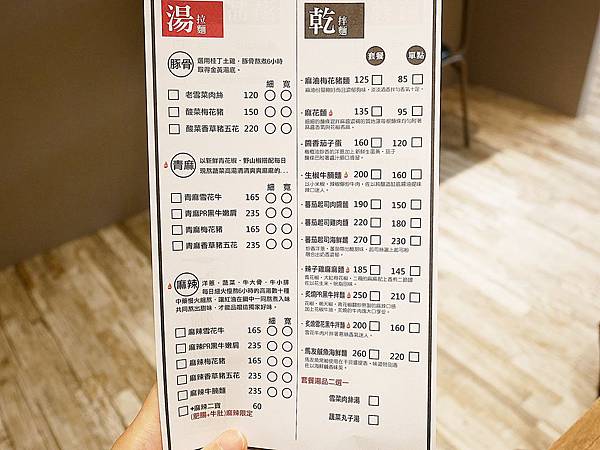 先附上菜單,麵分湯拉麵和乾拌麵,旁邊有"火"標示是辣味的。湯乾兩種麵都有不辣的口味,老人小孩也能放心進來享用,青麻的辣度沒有麻辣這麼高,聽店員介紹說約小辣左右,比較沒那麼刺激