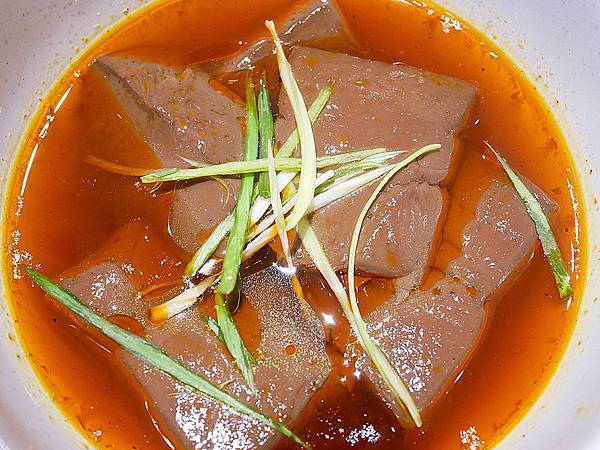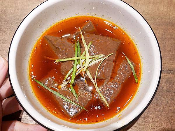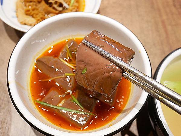 鴨血一份還不少塊,每塊鴨血都不小,入口咬下超多汁,用爆漿來形容一點也不誇張。鴨血的口感相當細緻,而且湯汁的辣度又僅是提味效果,所以不吃辣的朋友也能輕鬆品嚐,這款鴨血真的很好吃,吃麵來一份非常搭