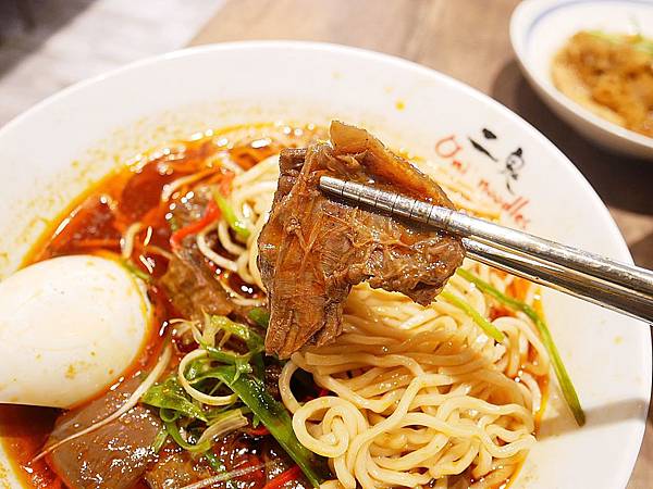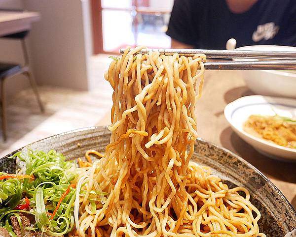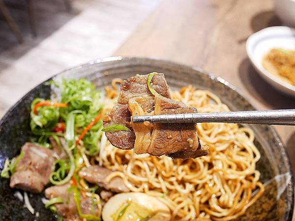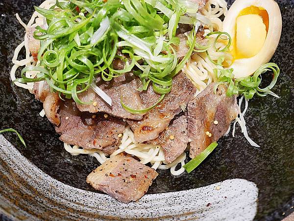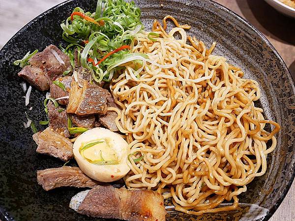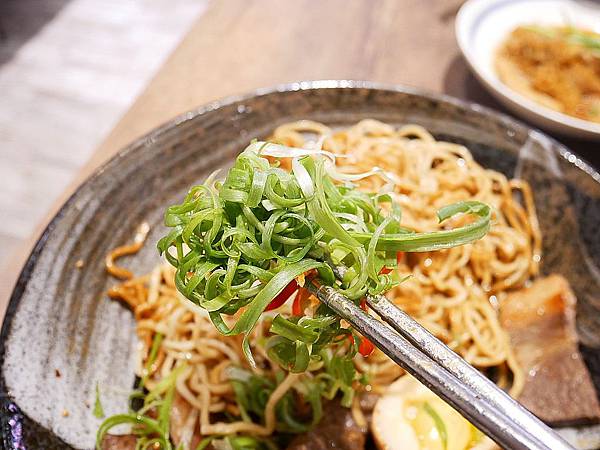 二鬼麵鋪的乾拌麵不像湯拉麵有兩種麵條可以選擇,而是固定使用細麵,乾拌麵份量還不少,除了滿滿炙燒PR黑牛之外,還有半顆溏心蛋和青蔥等等。剛上桌的時候,乾拌麵底部保留一些麻辣醬汁,這時候最好將麵拌開,記得盡快享用
