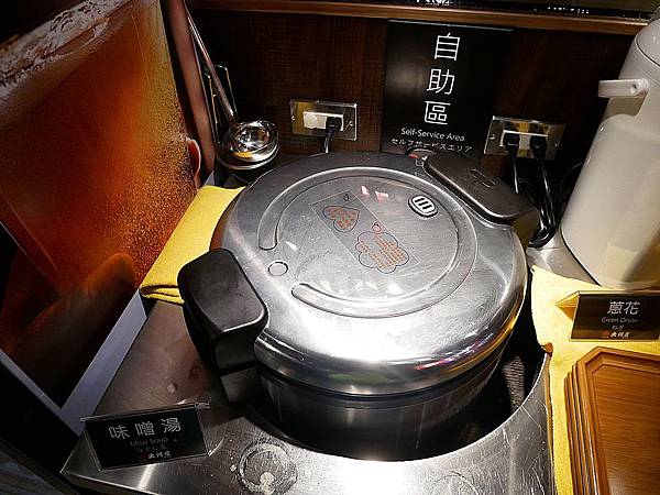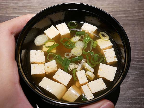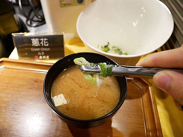味噌湯跟飲料一樣都是讓顧客自行取用,裡面的料還不少,旁邊還有蔥花可以加