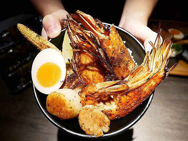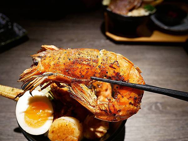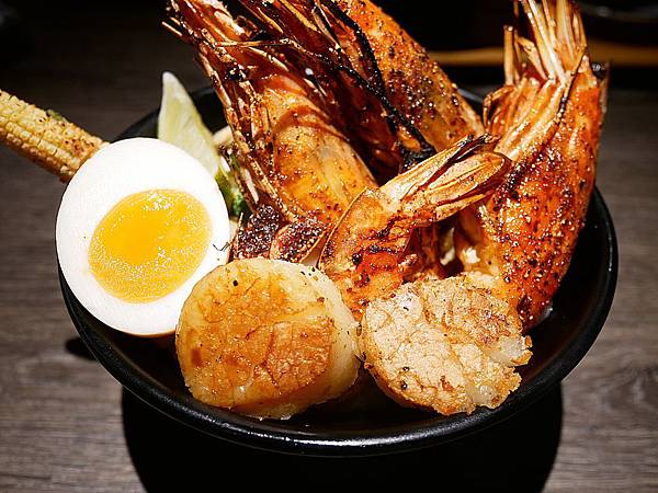 餐點一上桌,瞬間被兩顆炙燒過的干貝,還有三隻烤到酥脆入味的大蝦吸引住眼球
