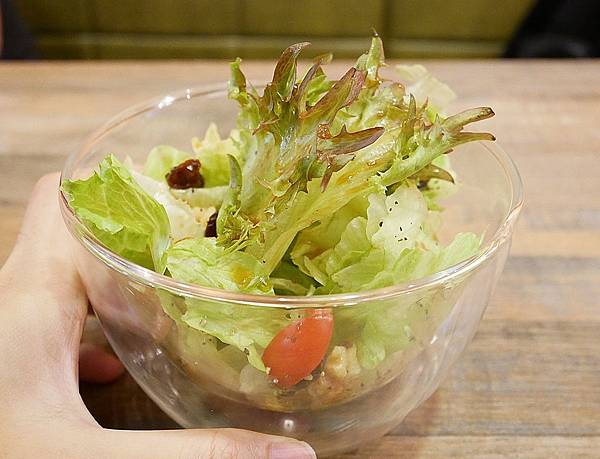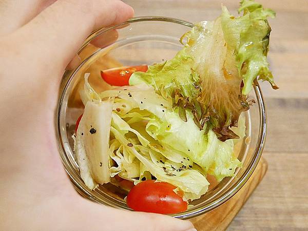 套餐的時蔬沙拉是使用油醋醬,酸度剛好很開胃解膩,搭配新鮮美生菜相當清爽