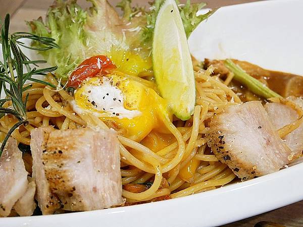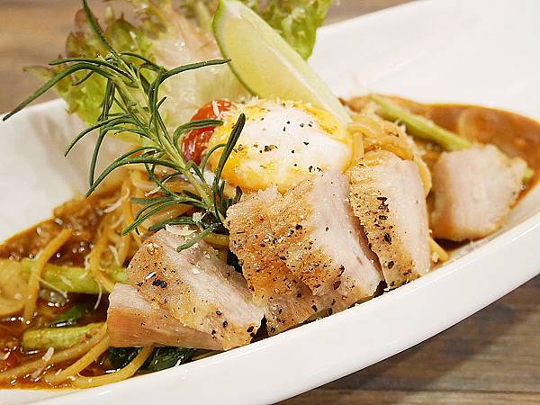 上頭除了松阪豬之外,還放上一顆水波蛋,一劃開蛋黃立刻流瀉下來