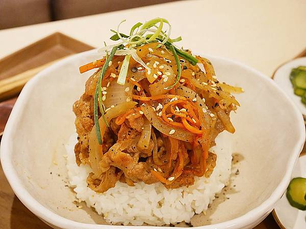 燒肉飯一上桌,超高的燒肉塔很吸睛,一層一層燒肉堆疊而成讓人想快點動筷子