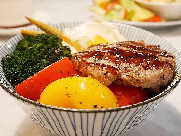 手打漢堡排不帶筋超好咬,肉本身的調味不會太重,搭配上頭淋的鹹甜BBQ醬汁味道超棒