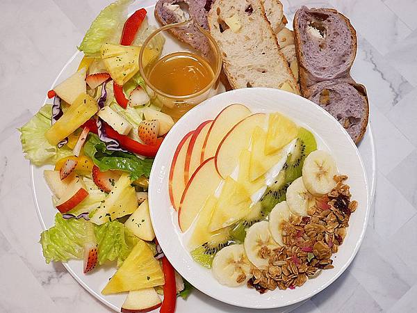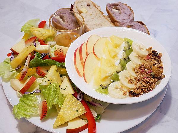 這款早午餐比較輕食路線,由蔬果沙拉、貝果和水果優格組成,是女孩們也能輕鬆解決的