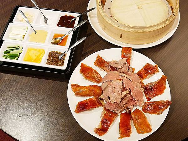 一般烤鴨單純提供麵皮、蔥段、甜麵醬和烤鴨