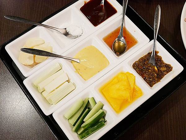 但九宮格皮鴨除基本食材外,還提供多種主廚調製的風味醬汁和搭配的黃瓜、蒜頭等等