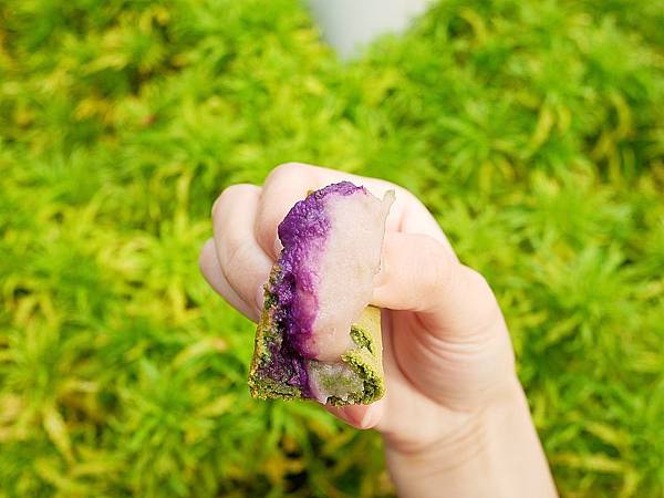 入口一起享用不僅能品嘗到外層抹茶的香氣,還帶有紫薯和芋頭的風味