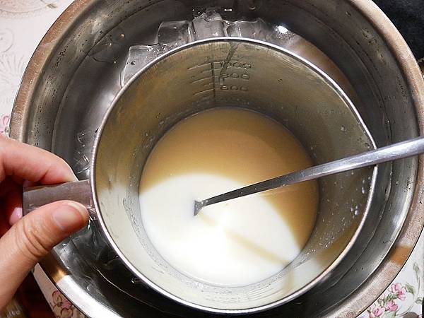 將冷凍羊奶隔著杯子放在冰塊內,並緩慢將氫氧化鈉放到冷凍羊奶上頭