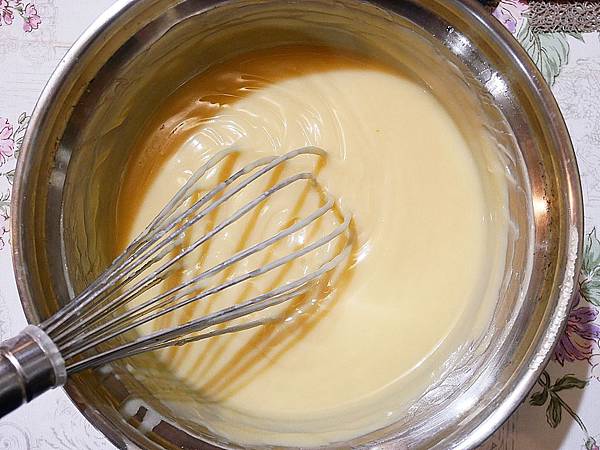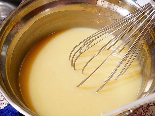 將拌入氫氧化鈉的羊奶加到綜合油鍋中,接著就要持續攪拌