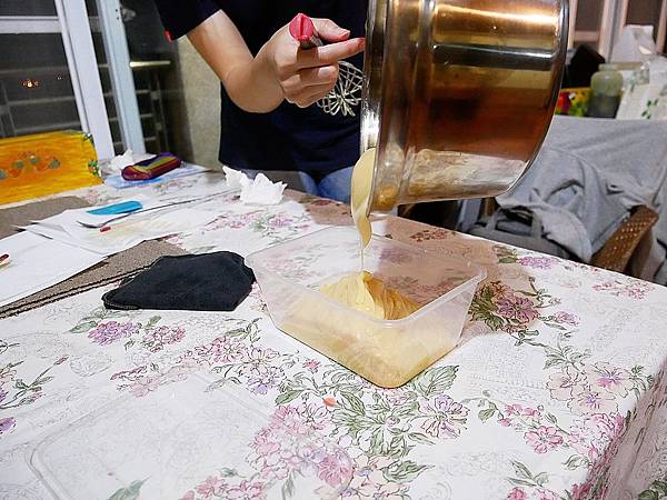 接著就可以倒入模型中靜置一晩,看皂化過程是否成功