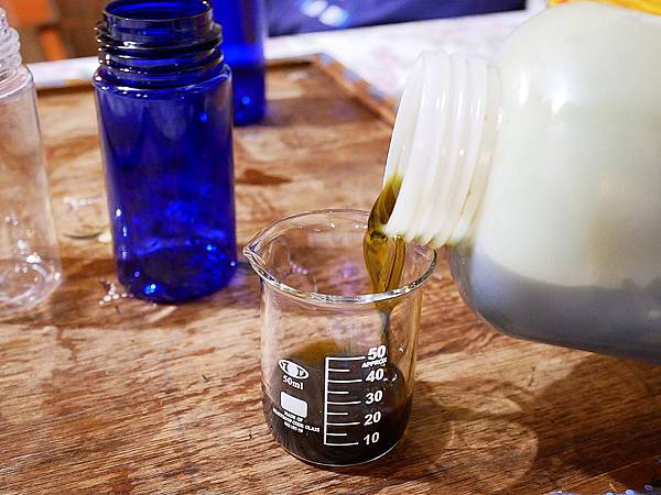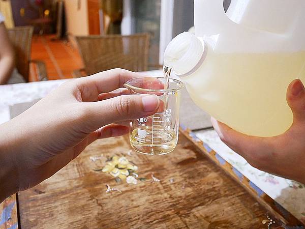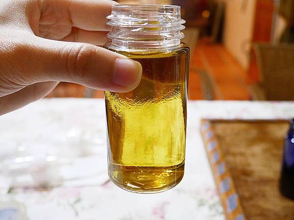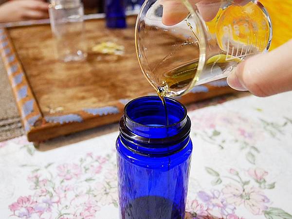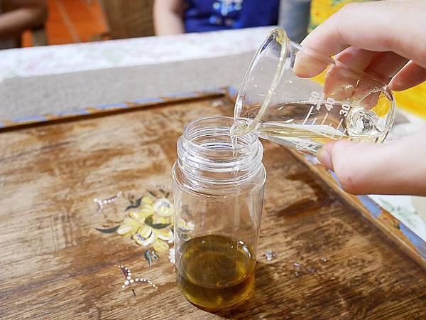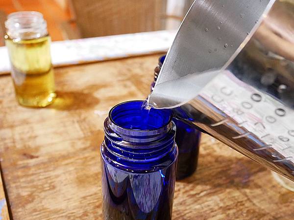 沐浴劑的製作過程很快速,將香草精油、甜菜鹼和蒸餾水依比例加入慕斯瓶內