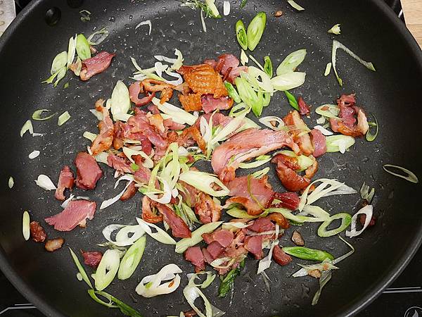 因為鴨賞已經是熟的,所以不用加油,直接把鴨賞和蒜苗下鍋翻炒一下就能快速起鍋